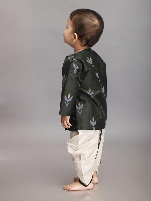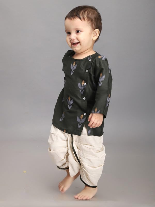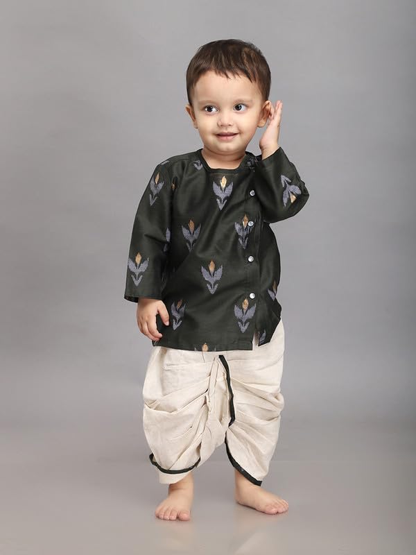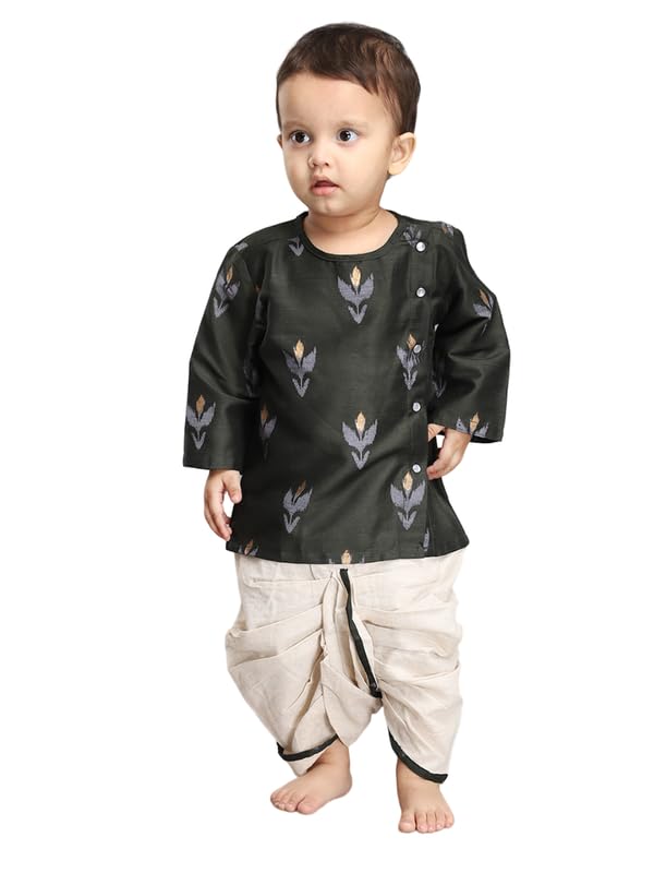 Introduce your little one to the charm of traditional wear with our Dhoti Set for Baby Boys. This outfit beautifully blends cultural heritage with modern comfort, making it perfect for festive occasions, family gatherings, or cultural celebrations. Product Highlights: Design: The Dhoti Set typically includes a kurta (tunic) paired with a dhoti (traditional Indian lower garment). The kurta often features intricate embroidery prints, printed while the dhoti is styled to provide a traditional yet comfortable fit. Material: Crafted from soft and breathable fabrics such as cotton silk ensuring comfort for your baby?s sensitive skin. The materials are lightweight and allow for easy movement, making the set ideal for active little ones. Fit: The kurta usually has a relaxed fit, while the dhoti features an elastic or drawstring waistband, ensuring a secure and adjustable fit for babies of different sizes.