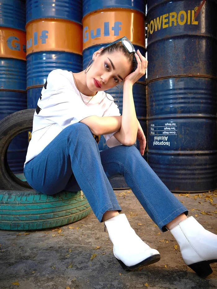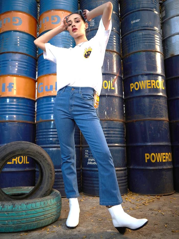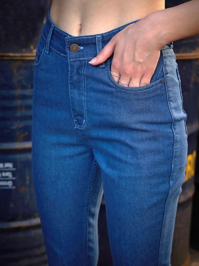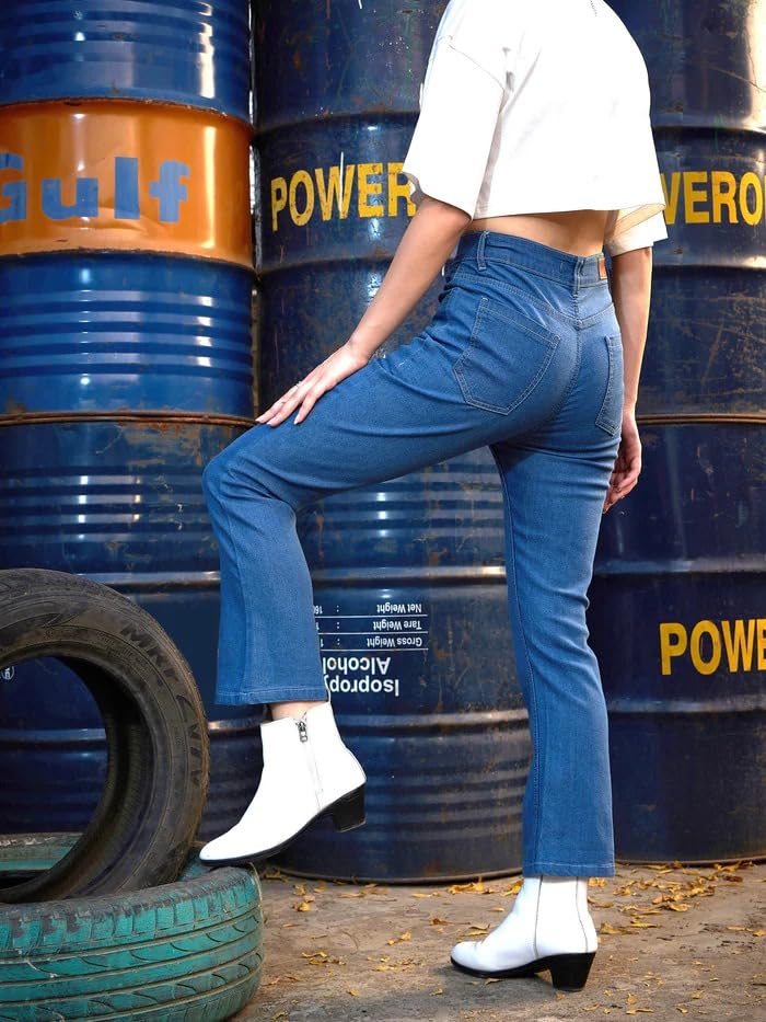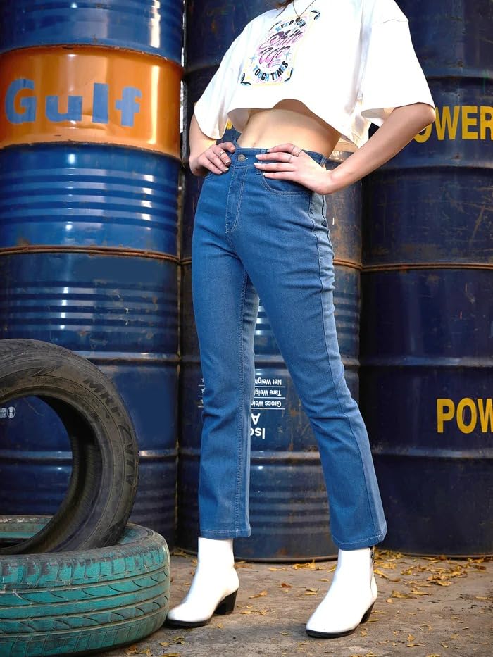 Blue Boot Cut Premium Jeans, in Denim fabric, Unlined, Ankle Length, Comfort Fit, Button Closure, Straight Hemline and features Crop Boot Cut Detail