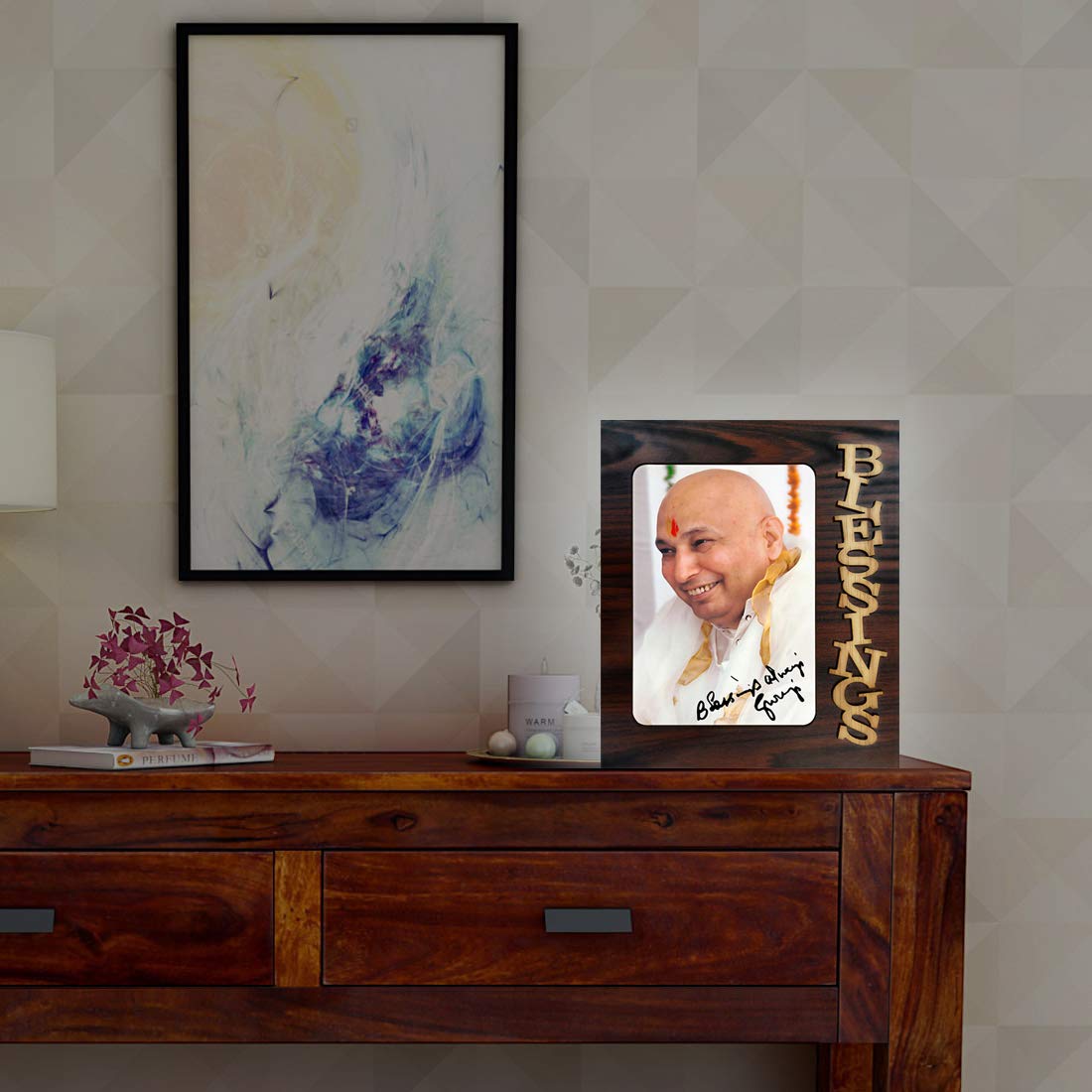Wooden hanging wall Guruji Blessing Photo frame can be applied to decorate your living room, bedroom, office, dining room, dormitory, gym, kitchen or classroom. Encourage your family and yourself with this religious gift.
